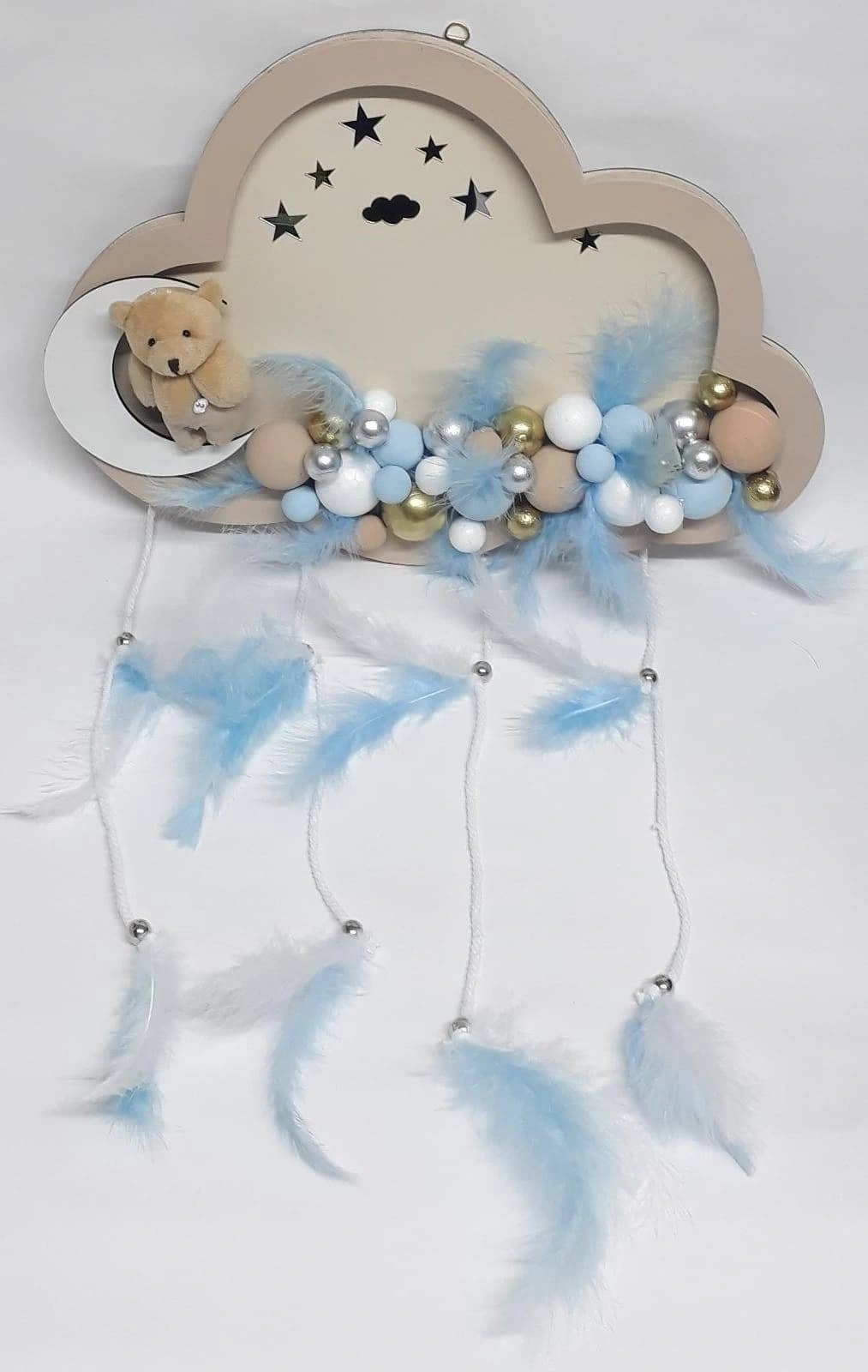 Ayıcıklı Bulut Ahşap Pano Bebek Kapı Süsü Açık Kahve - Krem