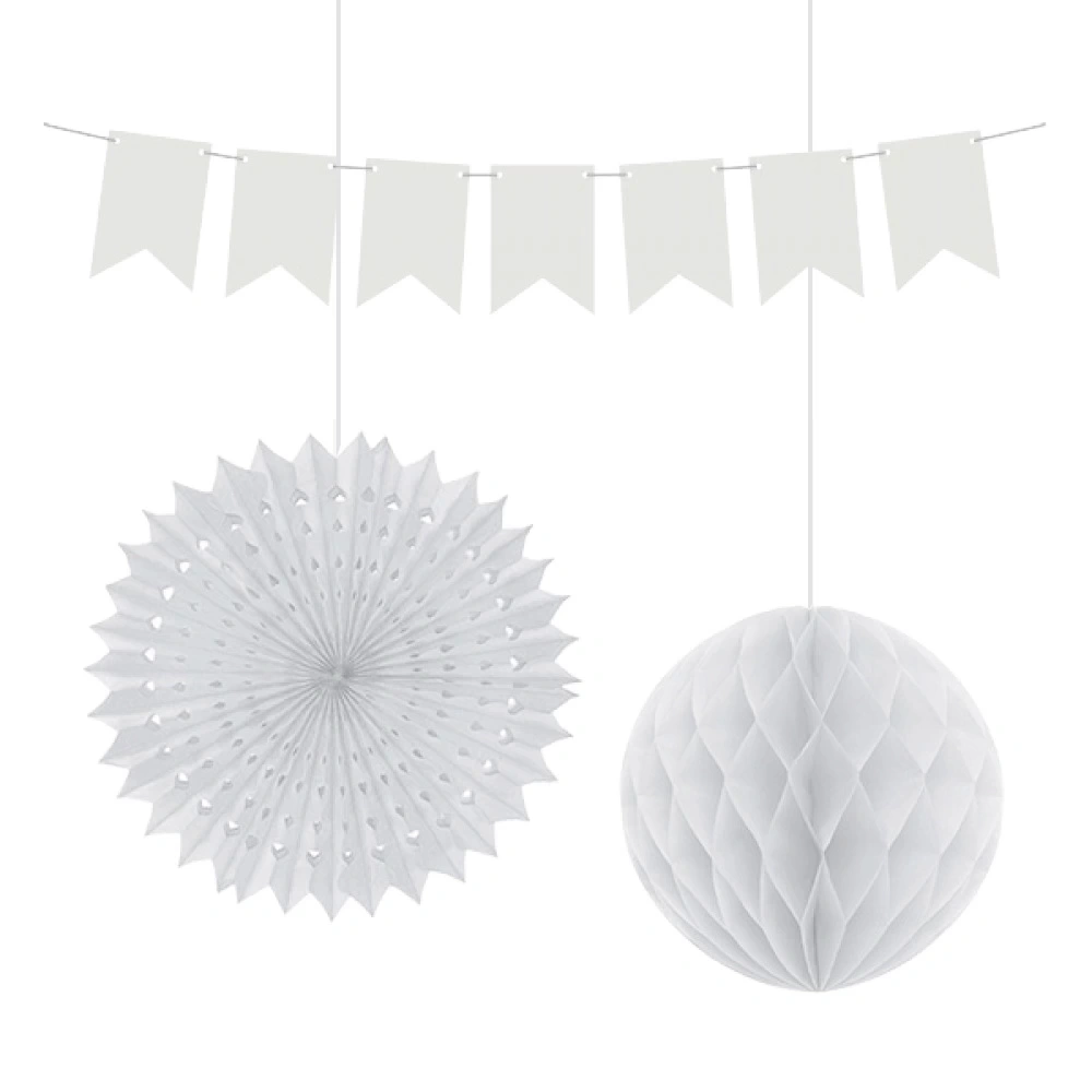 Beyaz kağıt süs seti kağıt malzemeden üretilmektedir. Düğün, nişan, doğum günü ve diğer tüm özel partiler için tercih edebilirsiniz.