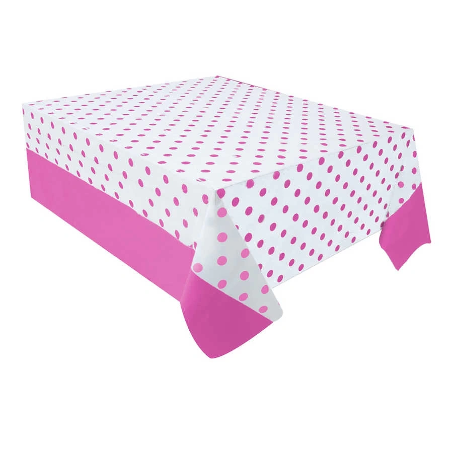 Fuşya puantiyeli plastik masa örtüsü ile harika bir sofra düzeni oluşturabilirsiniz. Parti sofrası hazırlığında masa düzeni son derece önemlidir. Masa örtüsü tercih ederek özel bir görüntü elde edebilirsiniz.