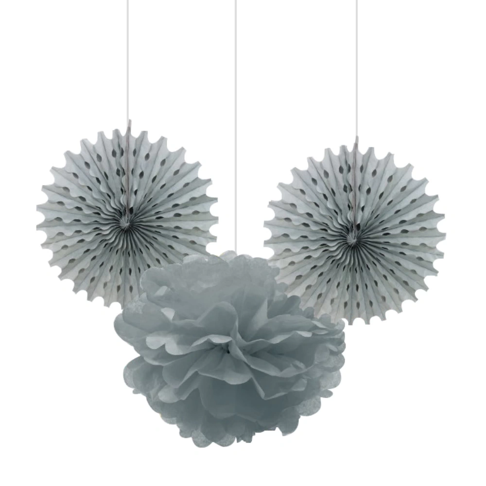 Gümüş ponpon / yelpaze kağıt süs seti kağıt malzemeden üretilmektedir. Düğün, nişan, doğum günü ve diğer tüm özel partiler