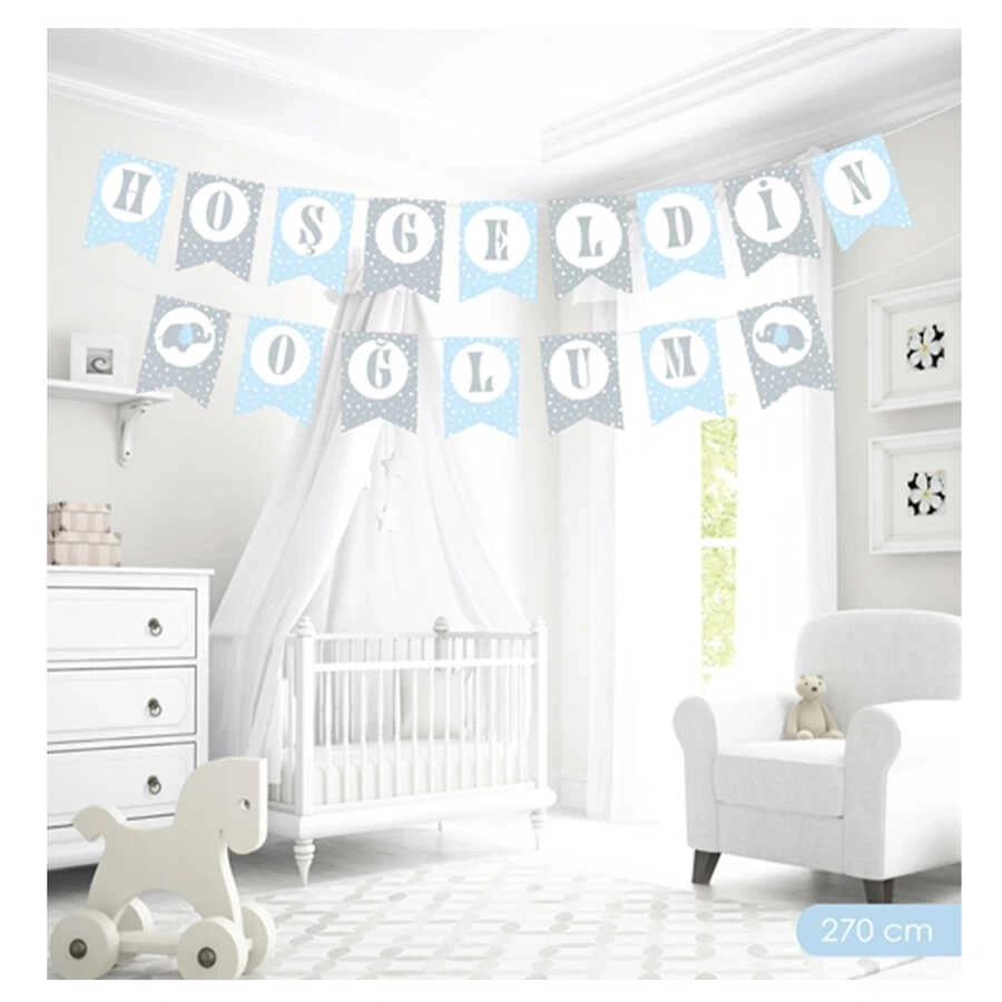 • Baby shower ve hastane odaları süslemelerinin vazgeçilmezi hoş geldin oğlum mavi harf afiş organizasyonlarınıza renk katacaktır.