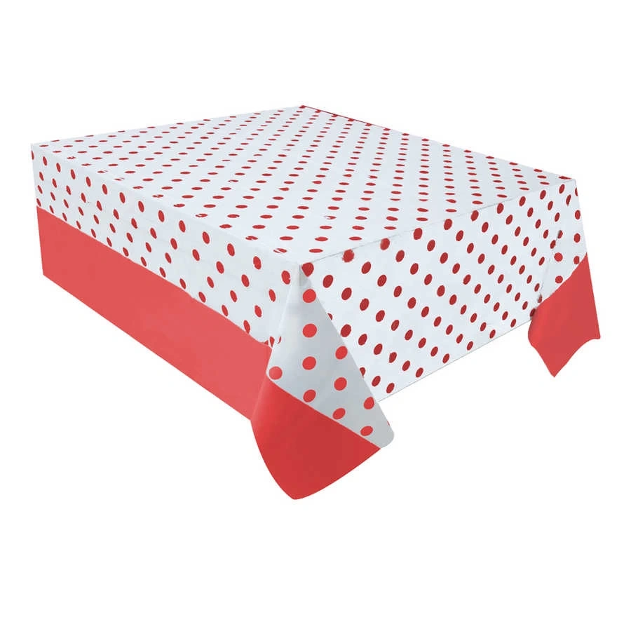 Kırmızı puantiyeli plastik masa örtüsü ile harika bir sofra düzeni oluşturabilirsiniz. Parti sofrası hazırlığında masa düzeni son derece önemlidir. Masa örtüsü tercih ederek özel bir görüntü elde edebilirsiniz.