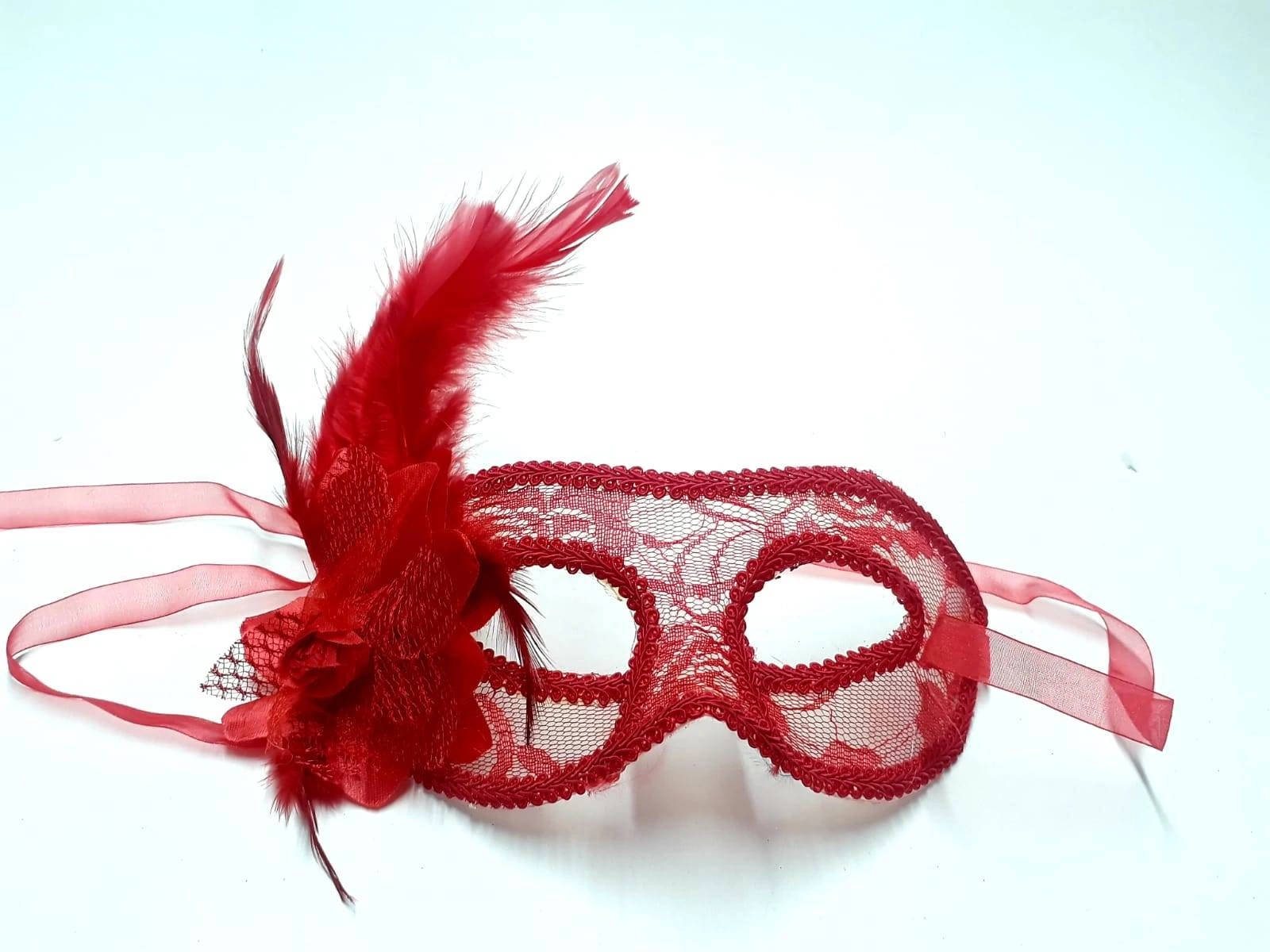 Kırmızı Renk Dantelli Güllü Tüylü Maske
