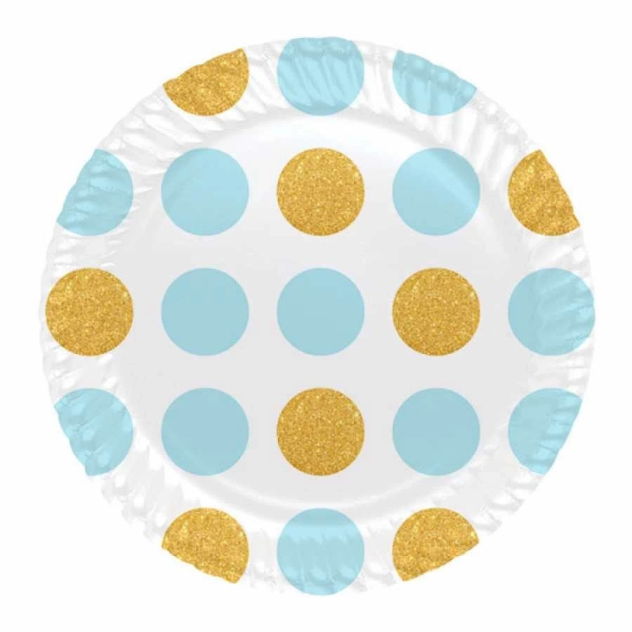 Mavi altın puantiyeli karton tabak ile çeşitli parti organizasyonlarında hazırlayacağınız sofralara renk katabilirsiniz. Sofranın daha şık bir görünüme sahip olması açısından tercih edeceğiniz karton tabak çeşitleri ile harika bir görüntü elde edebilirsiniz.