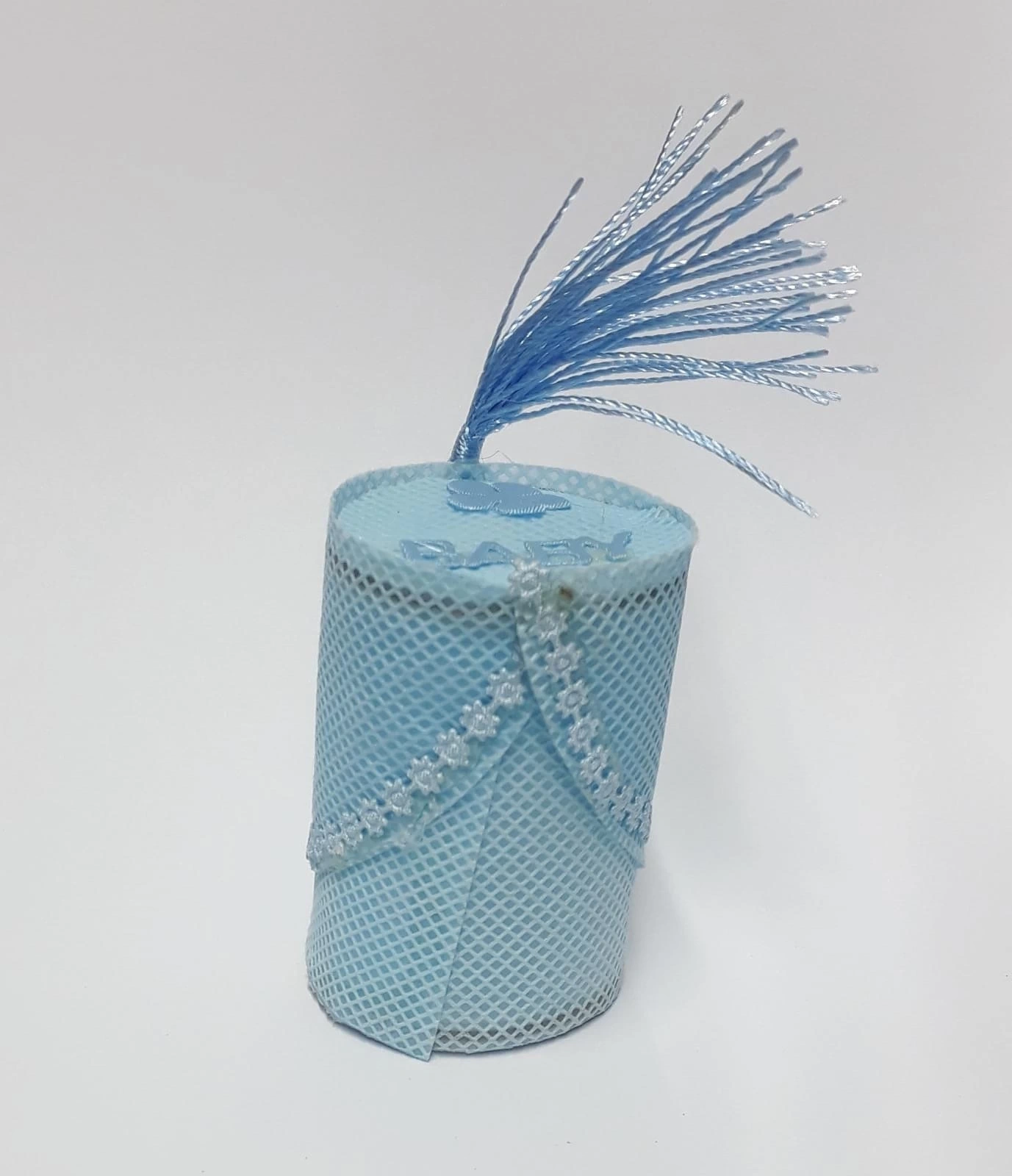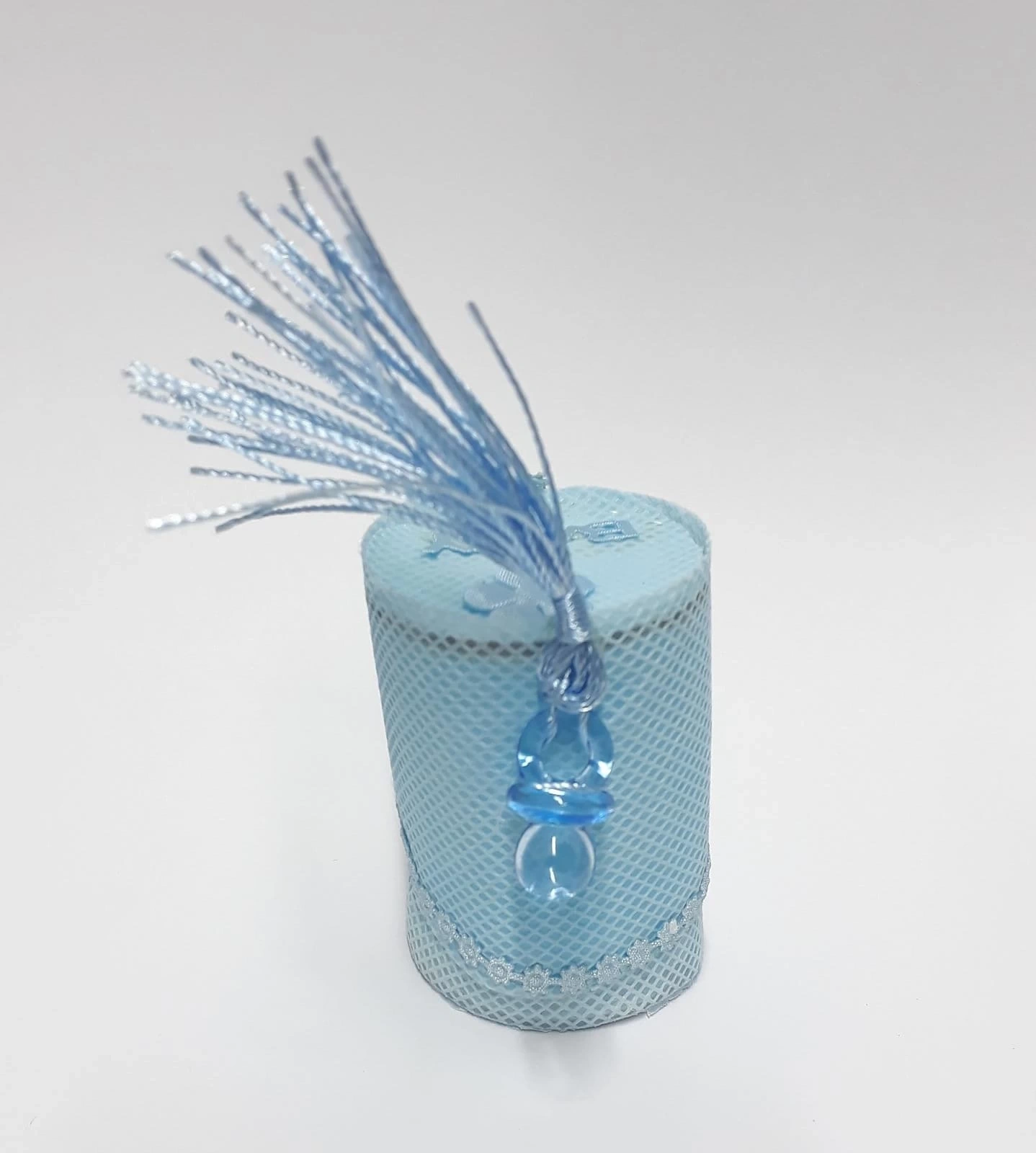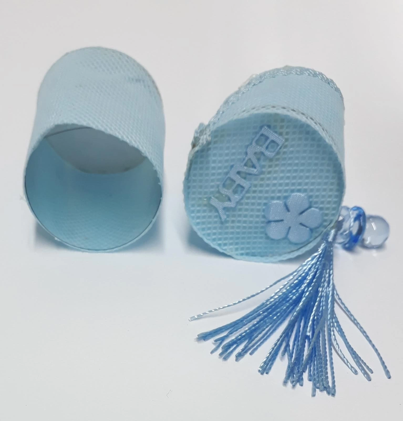 Mavi Püsküllü, Emzikli Silindir Bebek Hediyelik Kutu 12 Adet