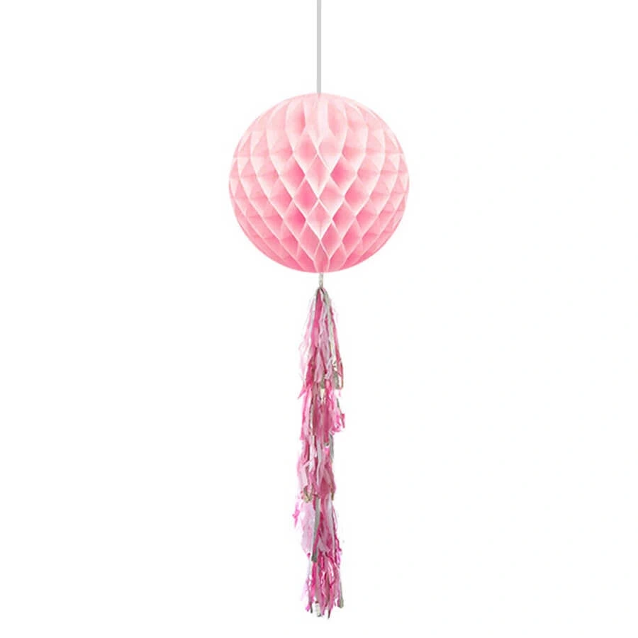Püsküllü pembe petek kağıt süs ile birlikte doğum günü, nişan, düğün, açılışlar ve diğer tüm organizasyonlarda dekorasyon hazırlığı yapabilirsiniz.
