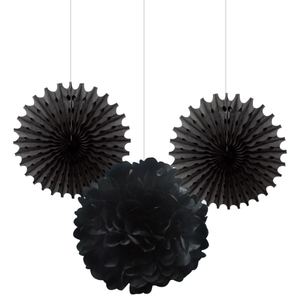 Siyah ponpon / yelpaze kağıt süs seti kağıt malzemeden üretilmektedir. Düğün, nişan, doğum günü ve diğer tüm özel partiler için tercih